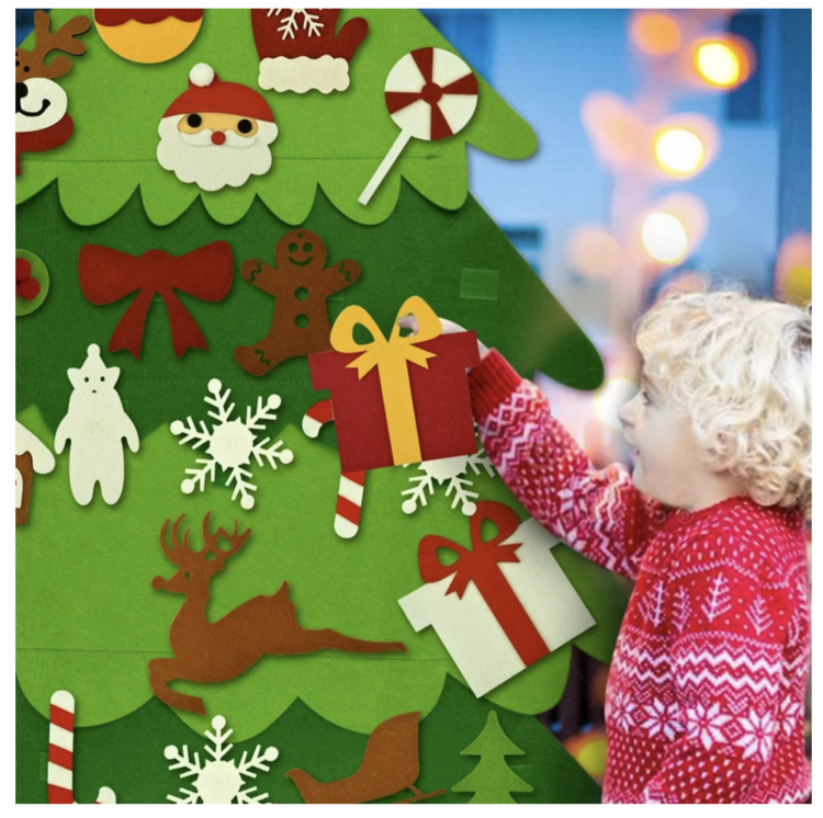 The tree also comes with tons of ornamentsĀ (also made with same high quality heavy felt) these also attach with stitched Velcro tabs unlike cheaper glued ones. Bells, presents, snowman, candy and snowflakes are some examples of the fleet ornaments included.