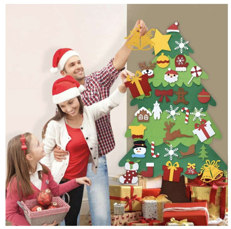 1PC DIY FELT CHRISTMAS TREE + 26PCS ORNAMENTS; ORNAMENTS INCLUDES SNOWFLAKE, SANTA, CHRISTMAS HAT, CHRISTMAS SOCKS, SNOWMAN, CANDY, AND BELLS, ETC.
