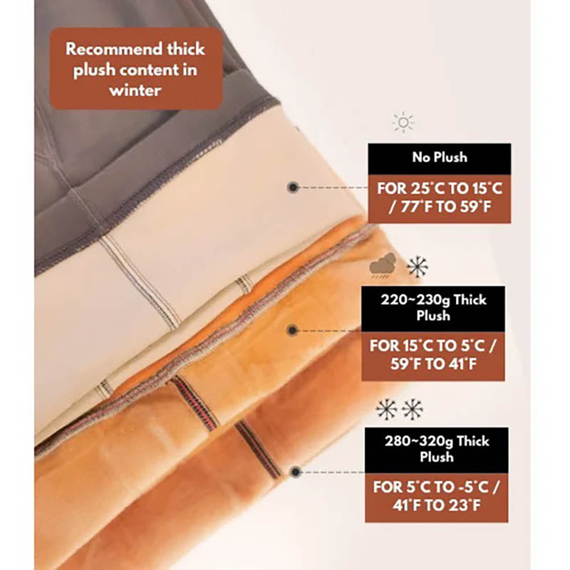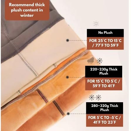 The COOL: 200G~230G and COLD:280G~320G versions have plush inner layer which is soft, comfortable and keeps you warm in cold seasons without being bulky. Let you feel the soft fluff that feels like baby skin.It is able to keep you warm even at -5 deg C (14 deg F).