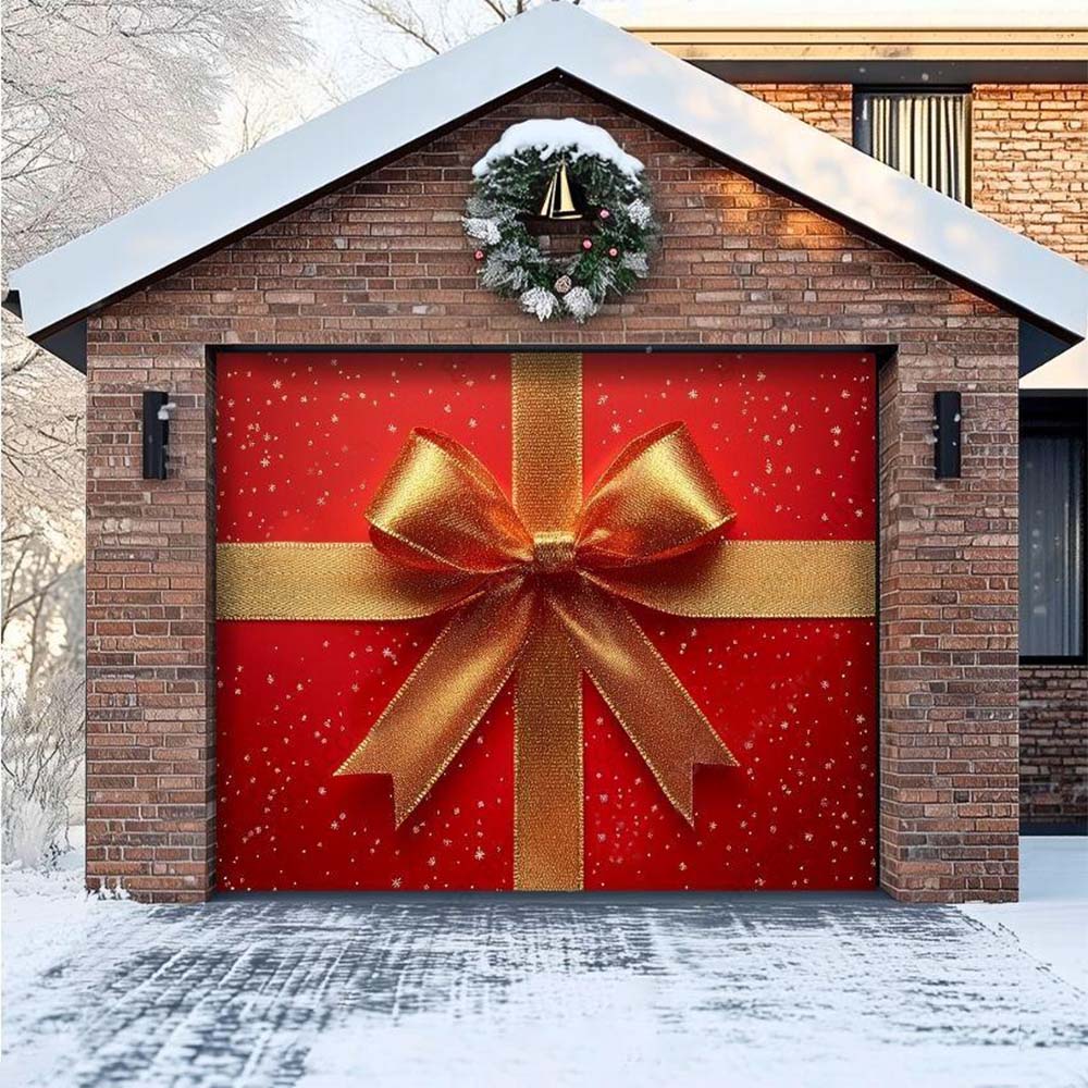 Transform your garage into a beautifully wrapped gift with this Gift Wrap Christmas garage door cover! Featuring oversized ribbons and a bold design, it creates the illusion that your garage is one giant present, ready to spread holiday cheer and excitement to everyone passing by. lt's one of the most creative Christmas decoration ideas to turn your home into a joyful centerpiece this season.
