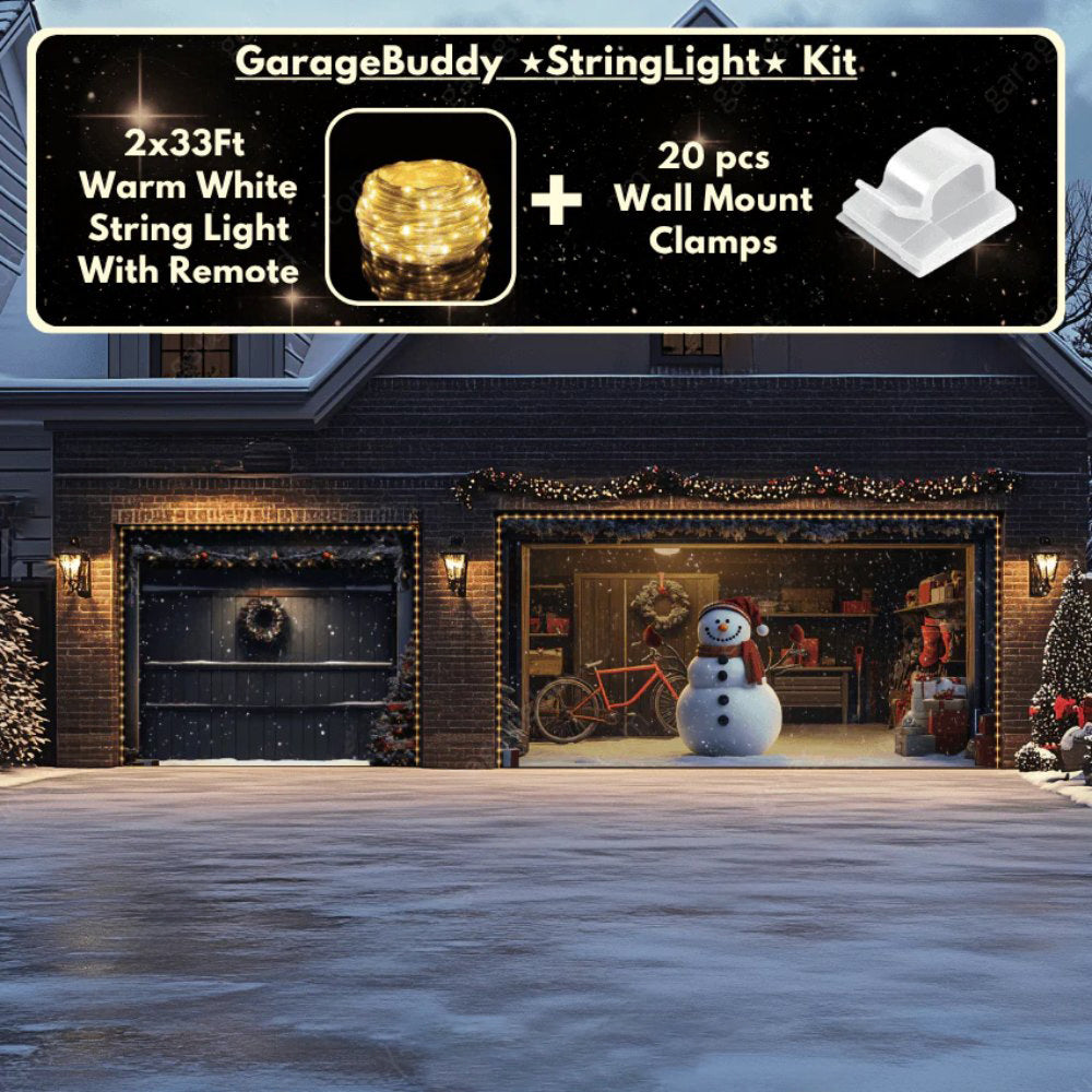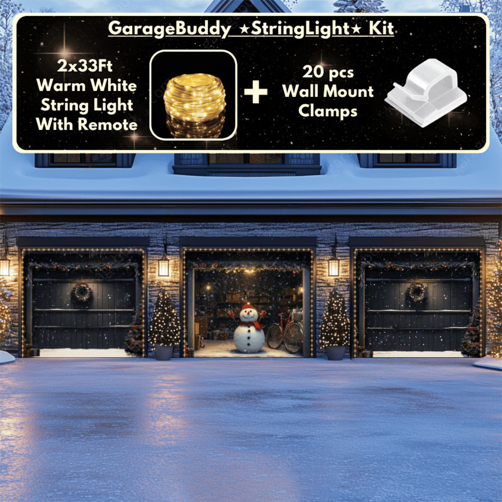 Now you can elevate your holiday display with our string light kit-available at 50% off! Pair your Christmas Garage Door Cover with glowing outdoor Christmas lights and turn your garage into a true showstopper. The kit includes 1x 33 ft warm white string light, a remote control, and 10x sticky wall mount clamps.