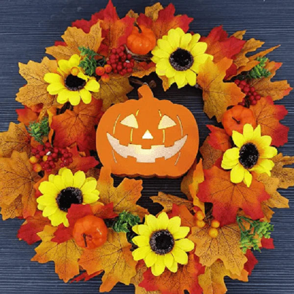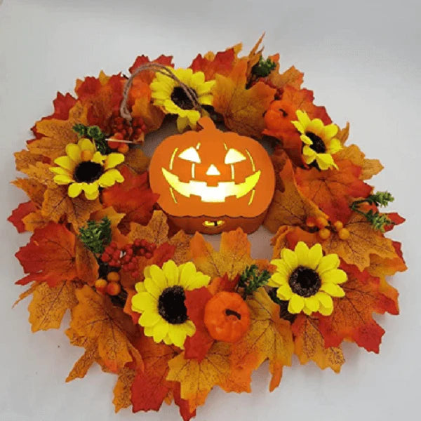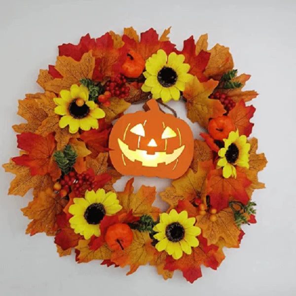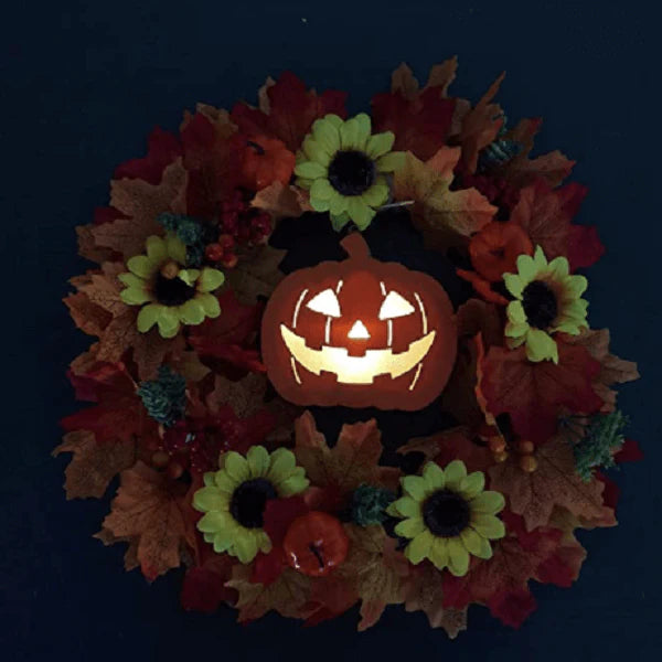 - This is a wreath that signifies a good harvest!It can be placed anywhere in front of doors, fireplaces, gardens, etc.In the center, is the iconic light-up pumpkin jack-o-lantern surrounded by beautiful fall foliage and smaller pumpkins.